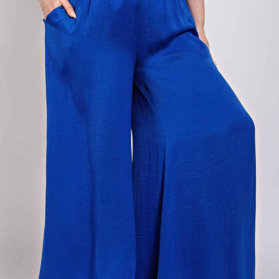 Add the Washed Satin Wide Pants with Waist Smocked in Royal Blue to your wardrobe today and enjoy the perfect blend of luxury, comfort, and vibrant style!