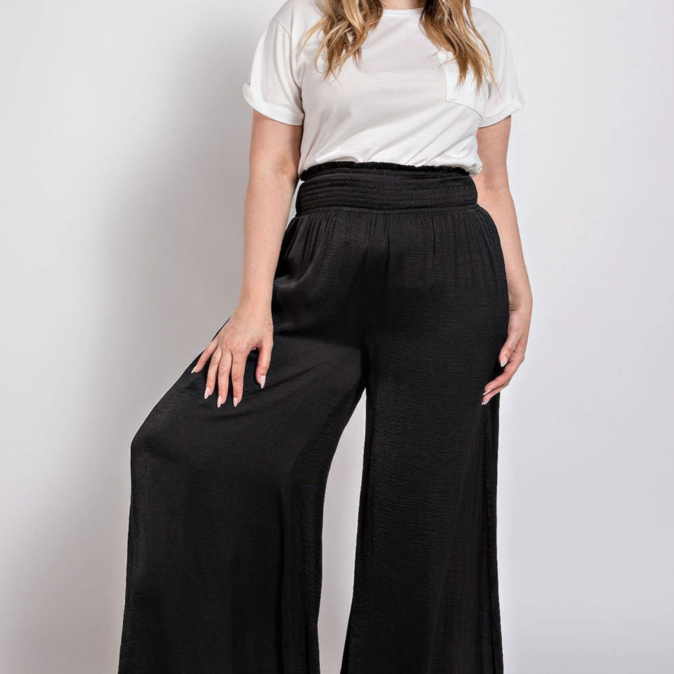 Add the Washed Satin Wide Pants with Waist Smocked in Black to your wardrobe today and enjoy the perfect combination of luxury, comfort, and versatility!