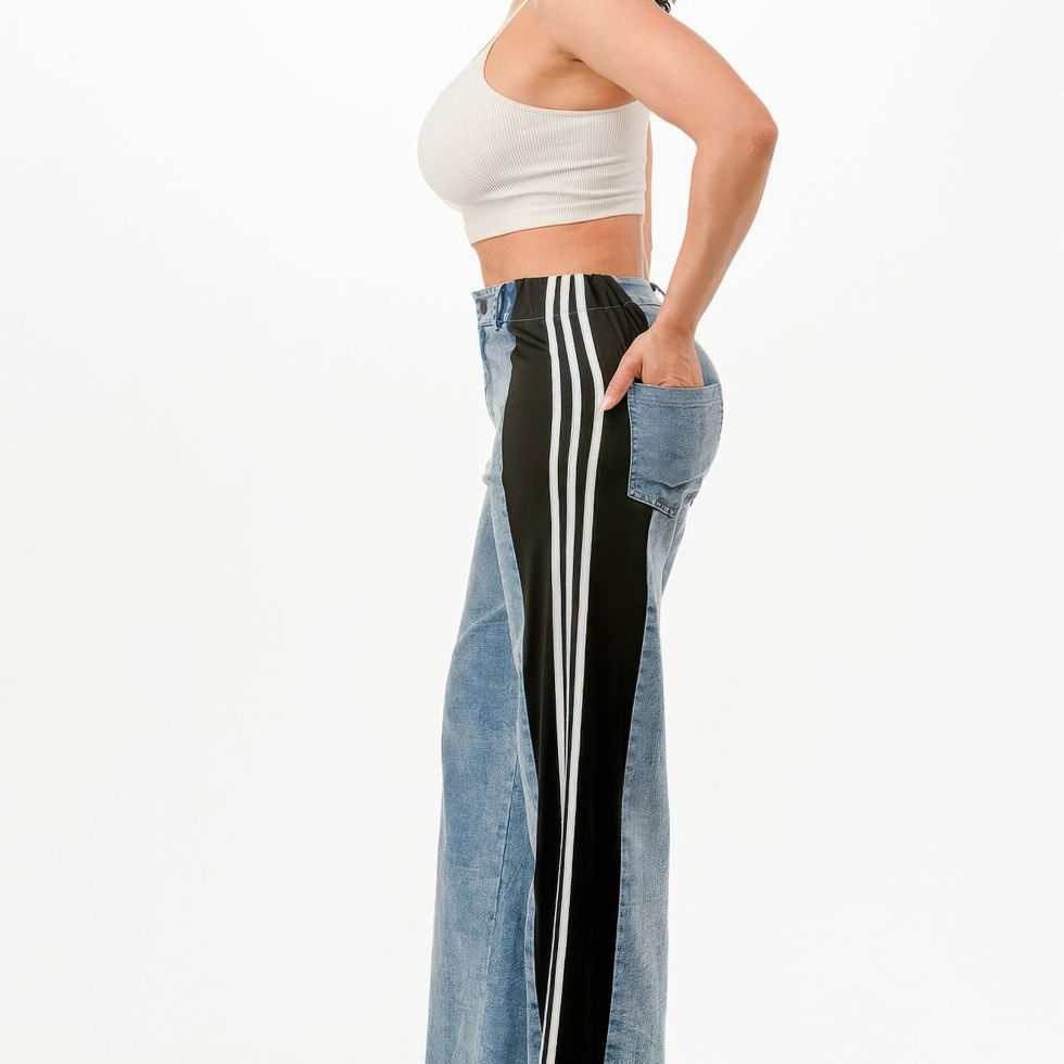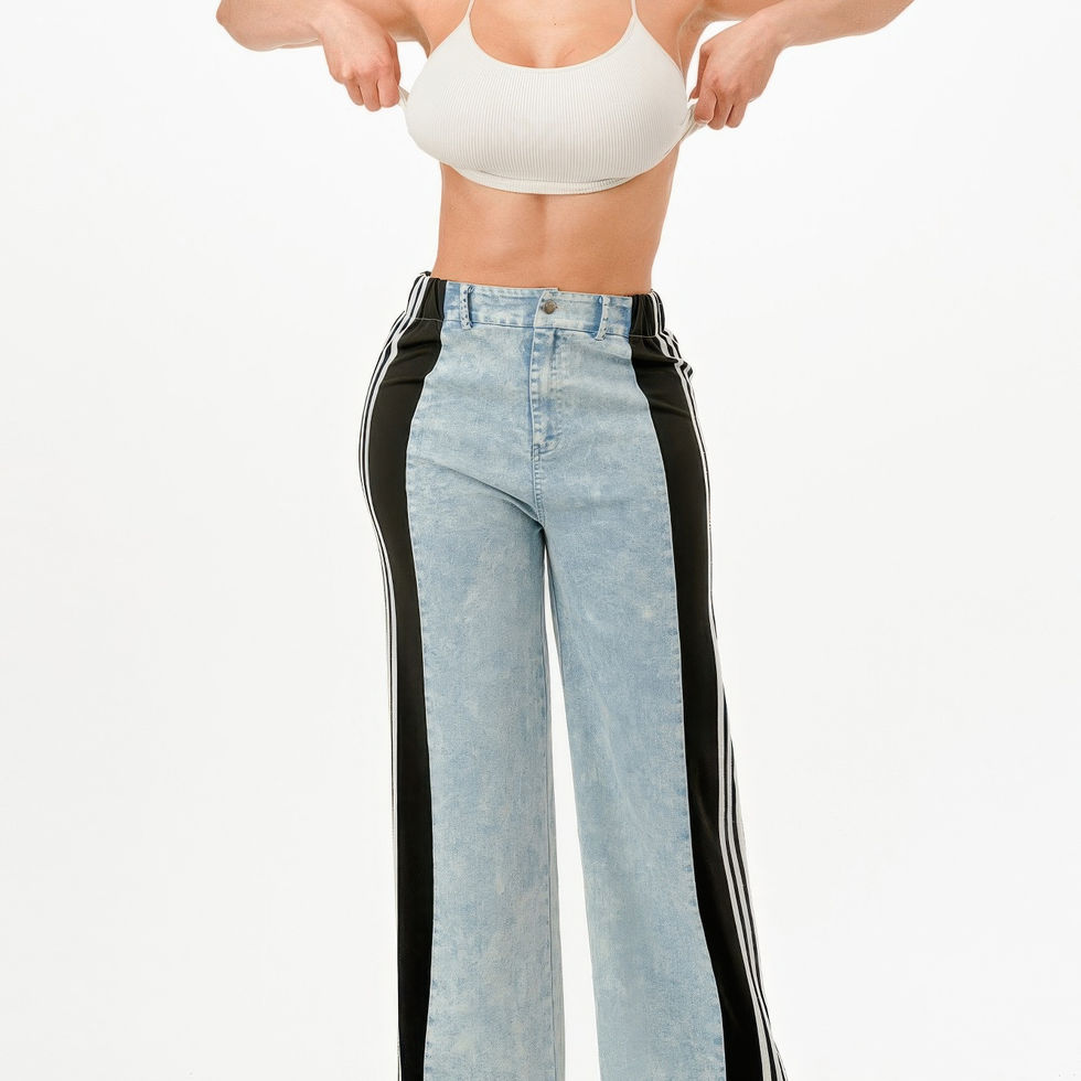 These wide leg jeans with stripe detail bring a modern edge to a timeless silhouette. Designed with a high-rise waist and bold side stripe accents, they elongate the legs while adding a sporty touch. The relaxed, wide-leg cut offers both comfort and movement, making them perfect for everyday styling. Crafted from a soft, stretch-blend denim, these jeans blend structure with flexibility. Available in three versatile color options, they’re a standout piece for effortless streetwear looks. Model is wearing US size S.