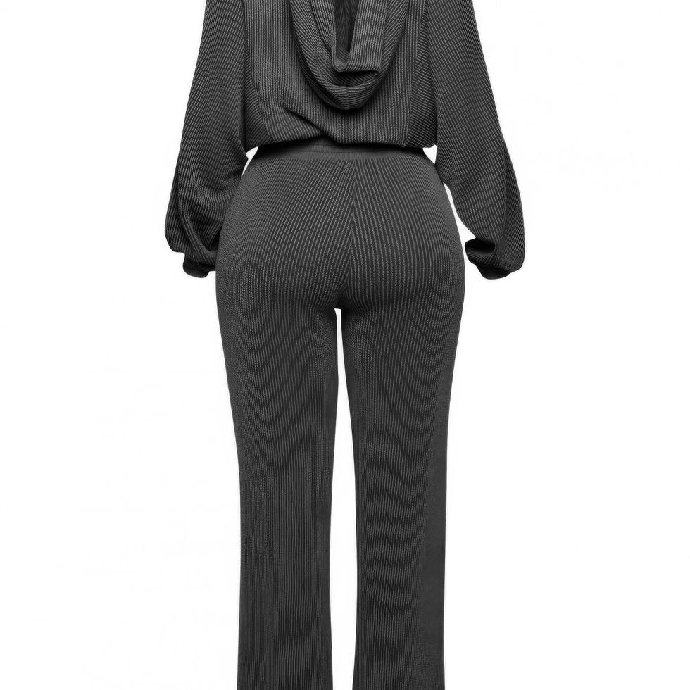 Stay comfortable and stylish in this zipper closure hoodie jacket and pants set, perfect for laid-back days with a polished twist. The ribbed fabric adds texture and stretch for a soft, flexible fit that moves with you. The hoodie jacket features a full zipper closure and long sleeves, while the coordinating wide-leg pants offer a flattering waistband and a relaxed silhouette. Functional zipper pockets add a touch of utility and convenience. Designed for comfort and versatility, this set is ideal for casual outings or elevated loungewear.